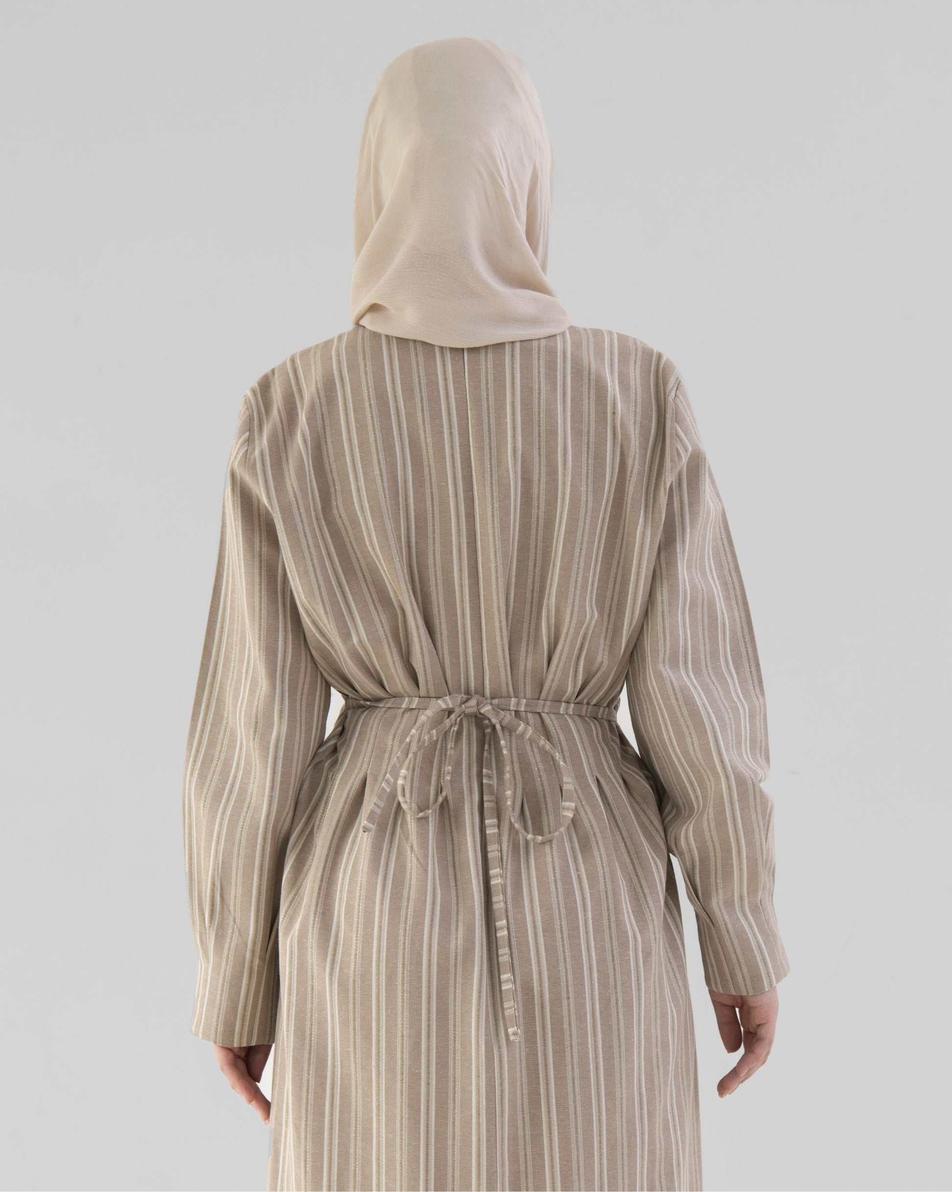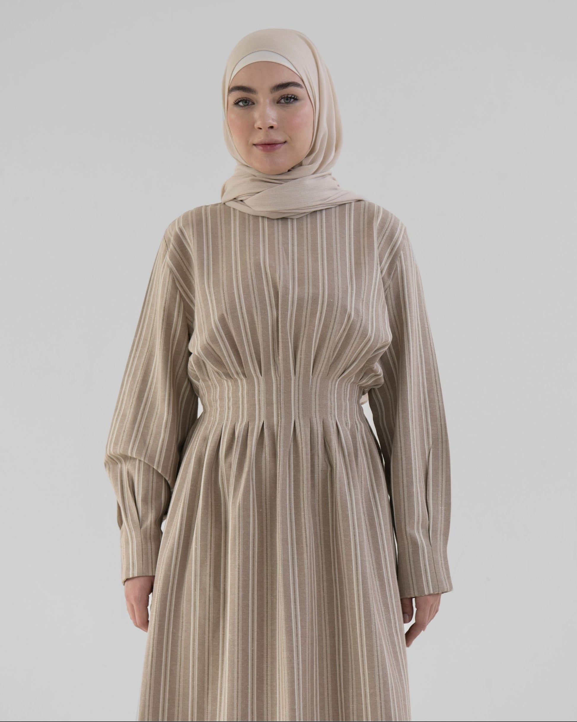 Soft stripes with golden threads, a sculpted waist, and a silhouette made to flatter.