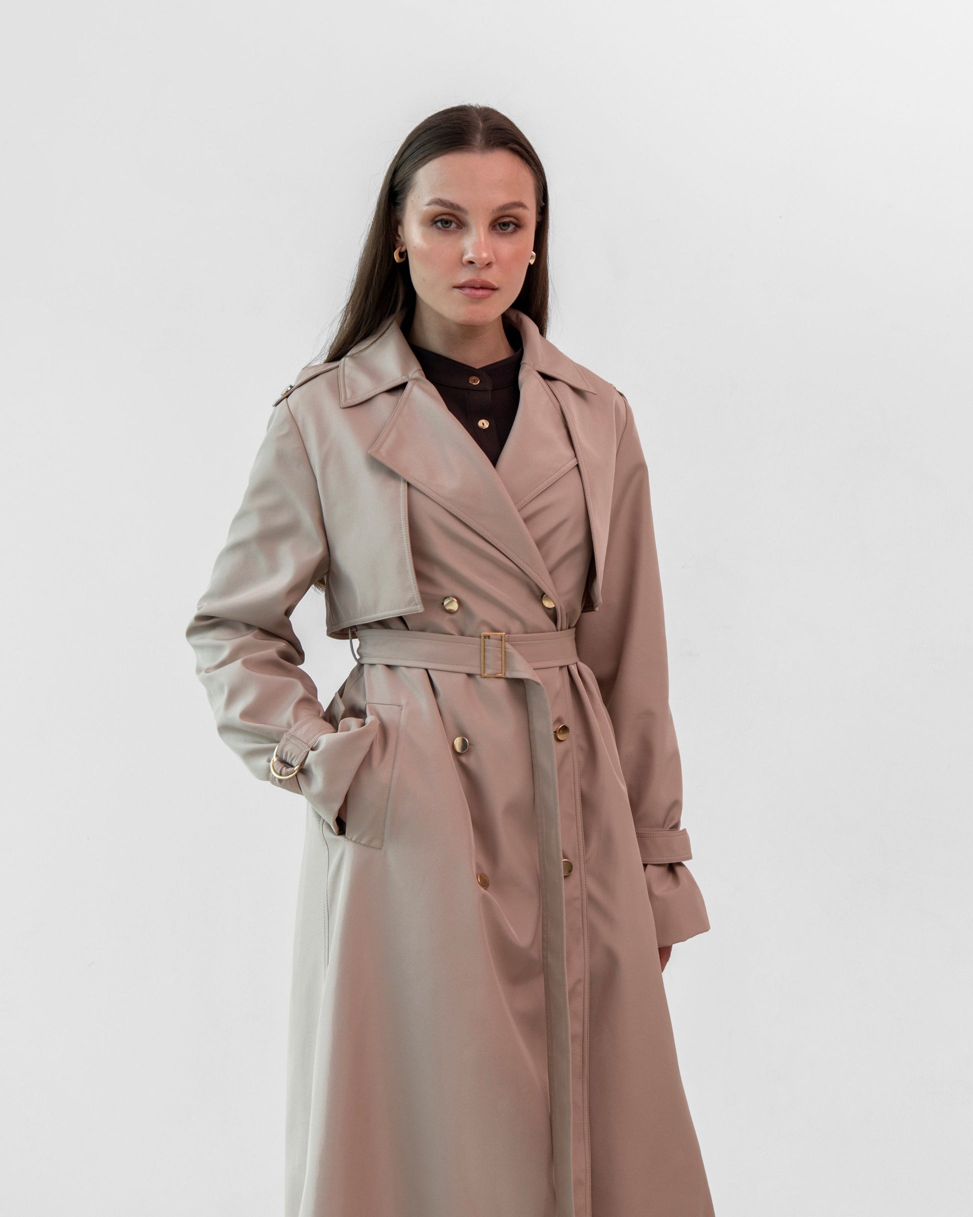 This beige maxi trench coat is waterproof and perfect for layering during winter and early spring. Its sleek design pairs beautifully with dresses and skirts, offering both style and practicality for unpredictable weather.